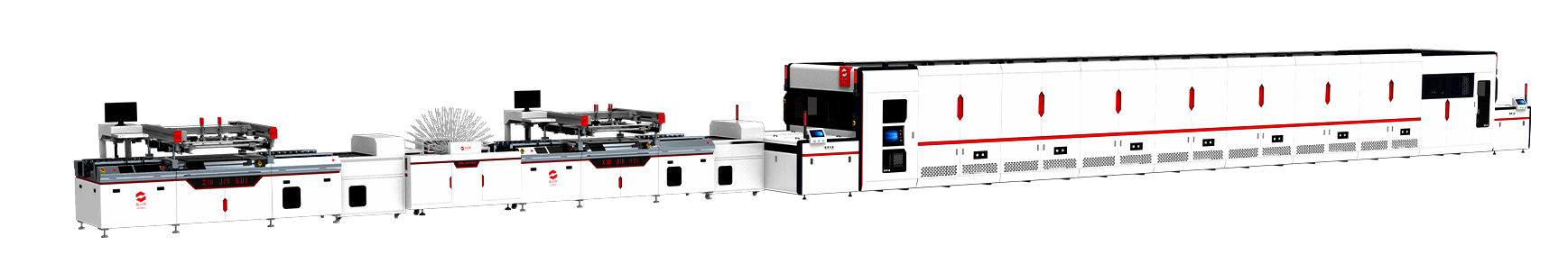 全自動阻焊兩機連印烘干生產線解決方案,主要由pcb線路板自動油墨樹脂塞孔機、兩臺自動文字絲網印刷機、文字后烤絲印烘干翻頁式pcb隧道爐組成,可實現3道工藝制程的智能全自動生產,可節(jié)省人工6-8人,分鐘產能高達7~8片,節(jié)能省電智能高效。